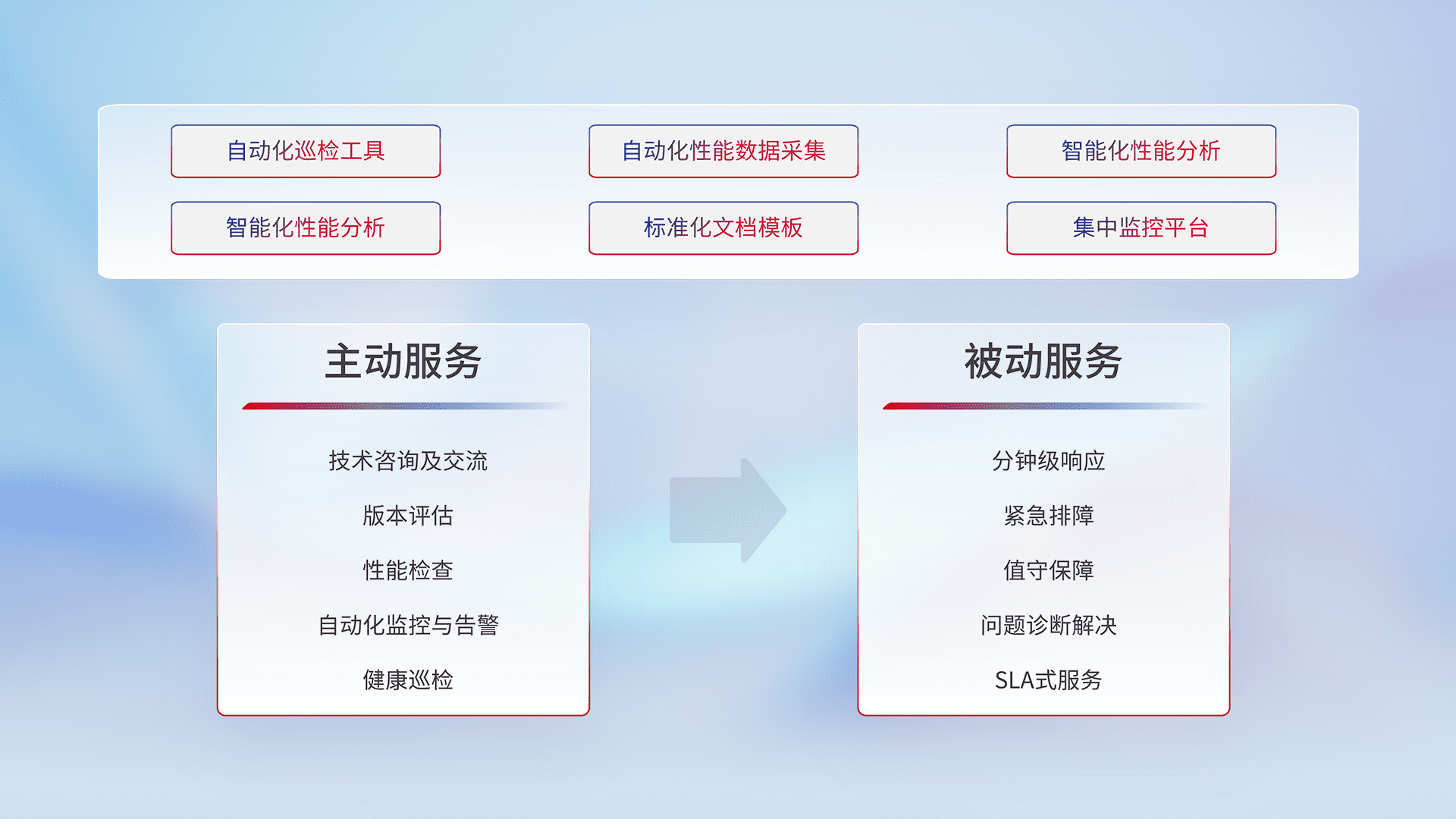 智能化工具和标准化文档,,,,保障服务质量,,提供主动服务(包含技术咨询、、版本评估、、、性能检查、、、自动化监控与告警、、、、健康巡检)和被动服务包含(分钟级响应、、紧急排障、、值守保障、、问题诊断解决、、、SLA服务)。。